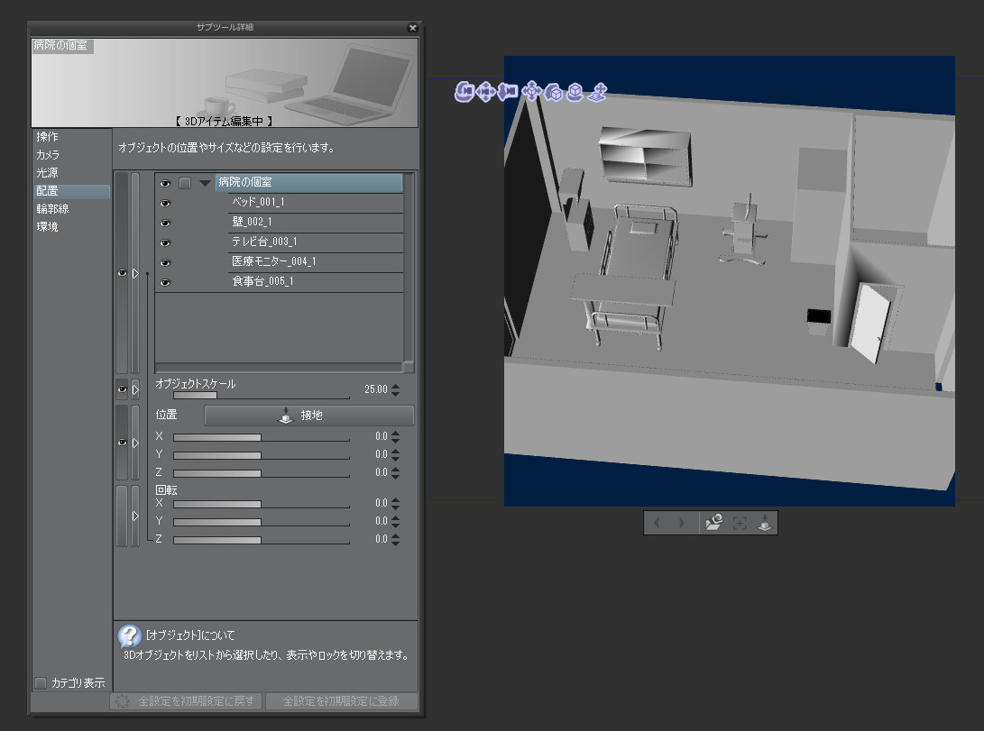 さっきのリクエストを書き替えました。 トライアンフさんにお願い! 病室ID:21589について この素材をCLIP STUDIO PAINTの3Dに欲しい‼ もう1つのリクエスト。この素材にこういう可動をつけてほしい。 ○ドアの開閉 ○壁が一枚ずつ非表示出来て自分がやりたい構図が作れる ○天井の非表示ができる ○道具を動かせる ぜひお願いします‼ |