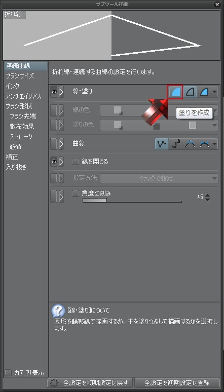 クリスタでも「折れ線」ツールの「サブツール詳細」ダイアログを表示、