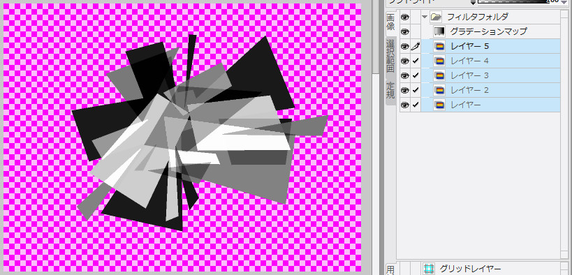 レイヤを何枚かに分けて三角形や四角形をいくつか描いたあと