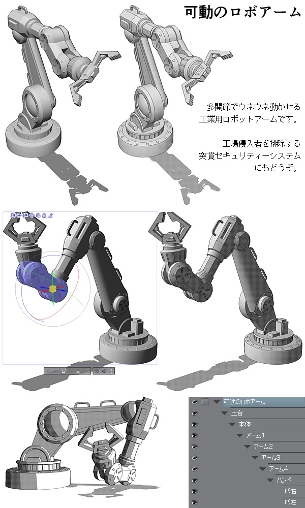 自動化の時代にあって、工業用ロボットを並べたシーンが欲しいと思い、 素材を探したところ無かったので、備忘録的にリクエストにあげさせて頂きました。 有償もちろんです。細部の作り込みまでは要らないというか、 簡易的な作り(アーム+台座)で、遠目で、それらしく見えれば良いイメージでおります。