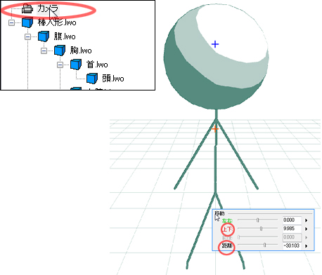 ④さらに[カメラ]を選択し[上下]スライダや[距離]スライダを使用して、お使いの環境で棒人形全身が見えるように調整します。