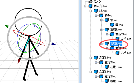 ③右腕をあげてみましょう。右腕の中の一番の親パーツは[右腕1.lwo]なので、[3Dワークスペースプロパティ] の[右腕1.lwo]を選択します。もちろん画面上の動かしたいパーツをクリックしても、選択されますが、複雑な階層構造になるほどパーツが重なって選択しにくいので、[3Dワークスペースプロパティ]のオブジェクト名をクリックしたほうが確実です。