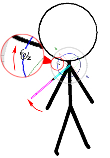 ②[棒人形.lwo]を回転すれば全体が回転します。[3Dマニピュレータ]の赤リング[水平]を奥側にまわして、棒人間全体がやや画面の右側を見るようにします。