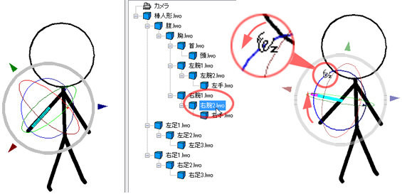 ⑥[右腕2.lwo]を選択し、[3Dマニピュレータ]の青リングを使ってひじを曲げます。