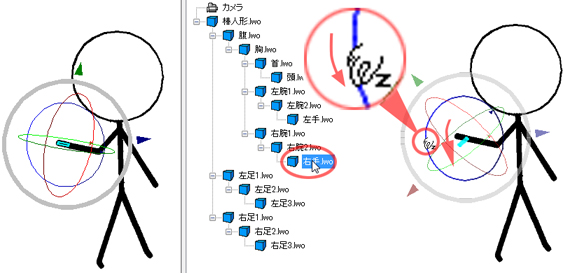 ⑦最後に[右手2.lwo]を選択し、[3Dマニピュレータ]の青リングを使って回転します。