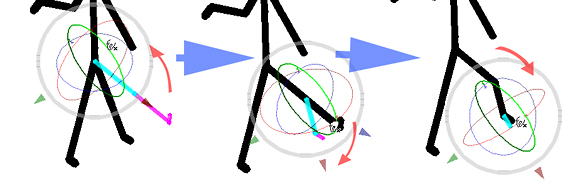 ⑨足も腕と同様です。どちらも付け根のパーツから先に回転させ、最後に先端のパーツを回転させていけばいいのです。このように手足は基本的に[回転]を使用して、ポーズをつけていきます。