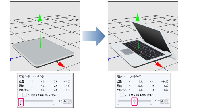④[位置]と[回転]の値を入力し、[ノード]の位置を調整します。調整結果は[ドキュメント]ウィンドウで確認できます。
