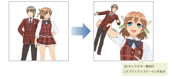 選択中の3D素材を拡大・縮小します。スライダーを右に動かすと、3D素材が拡大します。