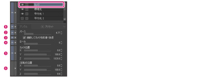 編集中の3D素材と同じレイヤーに含まれる、3D素材の一覧です。また、設定項目を選択することで、カメラや光源の設定画面に切り替えられます。