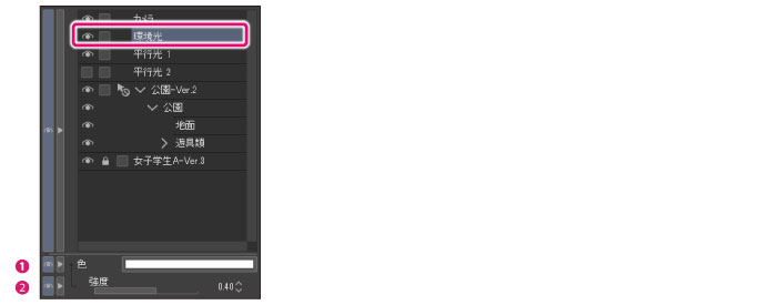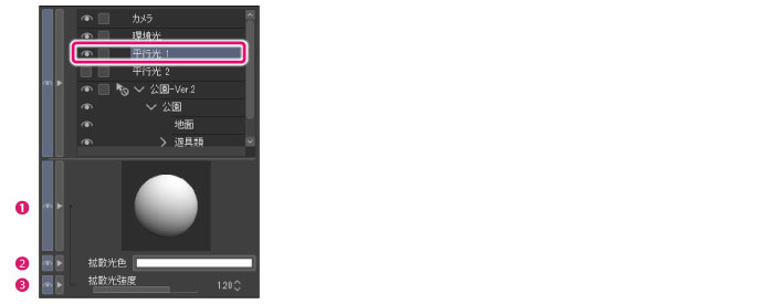 選択すると、[ツールプロパティ]パレットや[サブツール詳細]パレットの設定項目が、平行光に関する項目に切り替わります。[平行光1]を選択した場合の設定項目については、『平行光を選択した場合の設定項目』を参照してください。 |