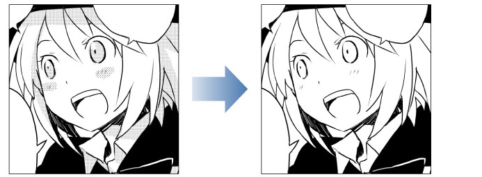 ·[トーンを消去(先行プレビュー)]は、ラスターレイヤーに対して実行できます。他のレイヤーには実行できません。 ·[表現色]が[カラー]のレイヤーに対して、[トーンを消去(先行プレビュー)]を実行すると、グレースケール画像に変換されます。 ·選択範囲を作成してから、[トーンを消去(先行プレビュー)]を実行すると、選択範囲だけに効果が適用されます。 ·縦×横のピクセル数が53,000,000 pixelsを超える画像に対して、[トーンを消去(先行プレビュー)]は実行できません。53,000,000 pixels未満の選択範囲を作成した場合は、[トーンの消去(先行プレビュー)]を実行できます。 |