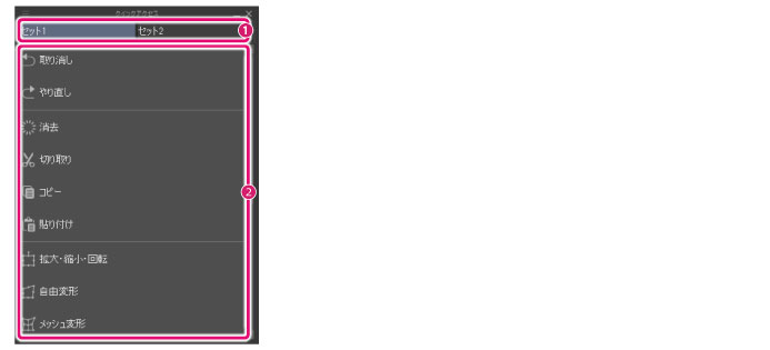 クイックアクセスセットに登録されている機能の一覧です。各ボタンには、ツール・メニューコマンド・オートアクション・描画色などの機能を登録できます。