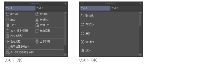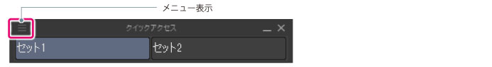 セットリストを非表示にした場合は、[クイックアクセス]パレットの[メニュー表示]→[セットの切り替え]を選択すると、表示するクイックアクセスセットを切り替えられます。 |