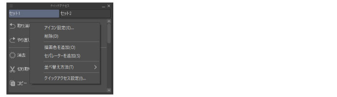 ·描画色やサブツールのボタン上でメニューを表示した場合、この項目は表示されません。 ·[アイコン設定]ダイアログで設定したアイコンは、[コマンドバー]や[選択範囲ランチャー]に同じアイコンを追加した場合も、設定内容が反映されます。 |