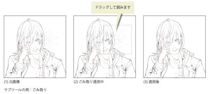 [サブツール]パレットで[ごみ取り]を選択すると、キャンバス上の細かいごみを消去できます。ごみを消去したい部分をドラッグして囲むと、ごみ自動的に検知して消去されます。