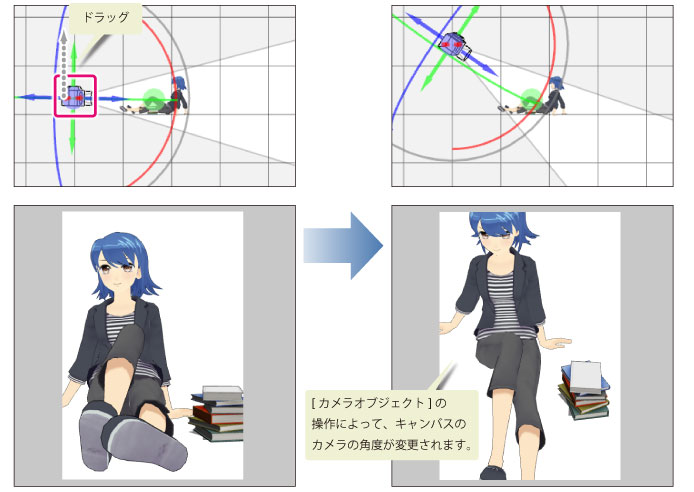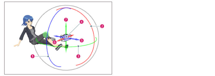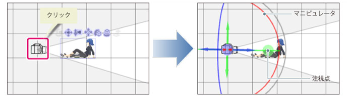 ·[カメラオブジェクト]をドラッグしても、カメラの位置や角度を変更できます。 ·[カメラオブジェクト]を操作しても、注視点の位置は変更されません。 ·[カメラオブジェクト]を操作しても、カメラは注視点に向いています。 |