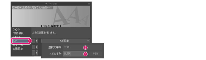 ルビの文字サイズや位置などを調整したい場合は、[サブツール詳細]パレットで設定できます。[サブツール詳細]パレットの設定項目については、『CLIP STUDIO PAINTツール設定ガイド』を参照してください。 |