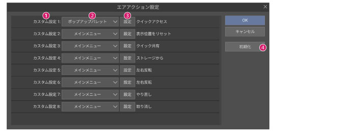 エアアクションに割り当てるCLIP STUDIO PAINTの動作を、プルダウンメニューから選択できます。項目を選択すると同時に、選択した機能に応じたダイアログが表示されます。