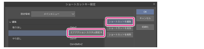 エアアクションの操作にCLIP STUDIO PAINTの動作を割り当てるには、[エアアクション設定]や[ショートカットキー設定]から行います。
