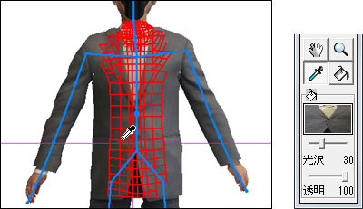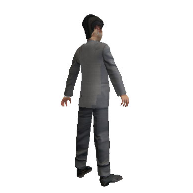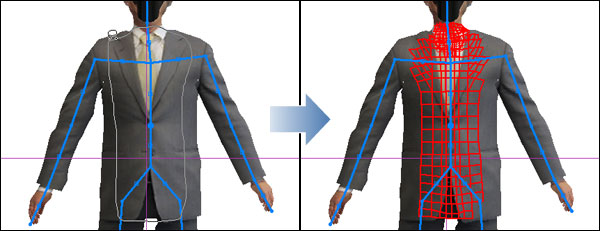 人体作成機能では、同じテクスチャを体のすべてのパーツに貼り付けます。 このため、背中にもおなかにも同じテクスチャがはられるので、たとえばスーツを着た男性は後ろから見ても背中が開いていて、不自然です。この背中部分のテクスチャを手作業で修正して、より自然に見せる方法を解説します。 |