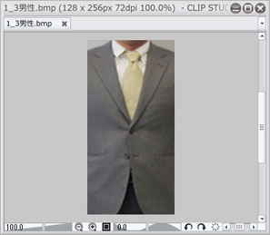 | (4)ペイントソフト上で、テクスチャが背中らしくなるように、シャツやネクタイの部分をジャケットの色で塗りつぶしてください。 塗りつぶしたら、ペイントソフト上で画像全体を選択し、「コピー」を選択してください。 |