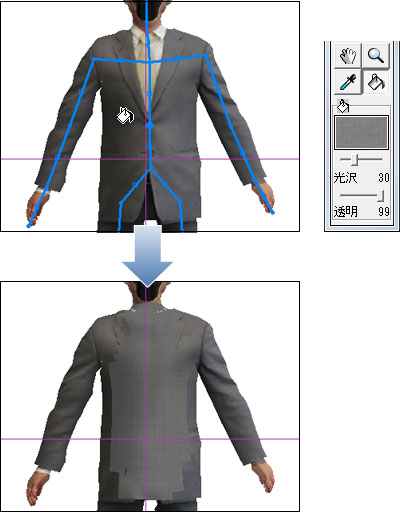 | 「肉付けも」モードで「バケツ」ツールを使うと、部分的にテクスチャの貼り付けができます。 |