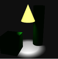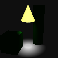 ソリッド立体ツールの円錐をスポットライトにすると、円錐の頂点が光源位置で、底面の方向に光が出るように見えます。円錐を細長く(高く)すると光の出る角度が狭まり、幅広く(低く)すると角度が広がります。(ただし、底面が楕円になっても光は楕円になりません) 立体の形や向きが同じなら、大きさが変わっても光源に影響を与えません。