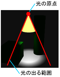「光源種類:スポットライト」にすると、選択した立体はスポットライトの光源立体になります。スポットライトはその中心から指定した方向の限られた範囲にだけ光が出ます。