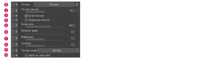 The [Dynamics] button allows you to select the settings of the tablet and the like which affect the strength of texture to apply. You can set the [Dynamics] button when [Apply by each plot] is turned on. For more information on dynamics, see "Dynamics settings" .