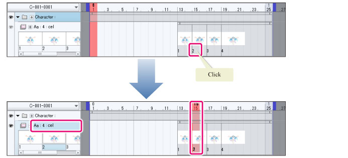 ·You can insert a frame by selecting [Animation] menu > [Timeline] > [Insert frame]. For details, see "Insert frame". ·You can delete a frame by selecting [Animation] menu > [Timeline] > [Delete frame]. For details, see "Delete frame". |