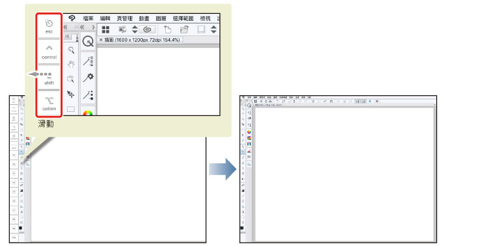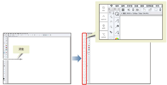 切換至[放大鏡]工具時,在畫布上拖拽即可如下述內容般放大、縮小顯示。 ·放大顯示:向右拖拽 ·縮小顯示:向左拖拽 |